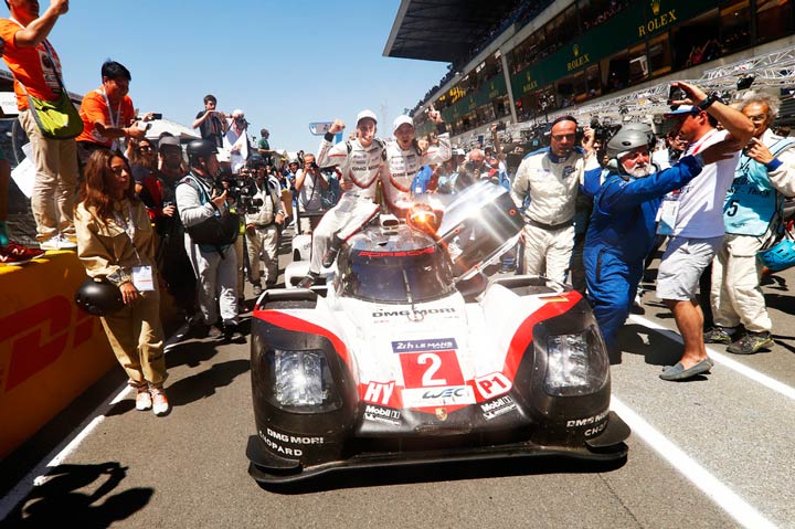 Porsche consiguió el tri en las 24 Horas de Le Mans. La triple corona consecutiva del 919 Hybrid en el Circuit de la Sarthe llegó tras una carrera dramática. A las 18:30 del sábado por la tarde, las 24 Horas de Le Mans parecían terminadas para el Porsche 919 Hybrid del alemán Timo Bernhard y los neozelandeses Earl Bamber y Brendon Hartley. Su auto se quedó sin tracción en el eje delantero, tuvo que entrar a los pits y los mecánicos estuvieron trabajando en él durante una hora y cinco minutos. Regresó a la pista en la posición 56, con 18 vueltas perdidas –unos 245 kilómetros atrás del líder– Pero la edición número 85 de la mítica prueba de resistencia francesa tuvo tal cantidad de cambios drásticos que lo imposible se hizo realidad al final: después de un esfuerzo enorme, el trío consiguió pasar de la penúltima posición a la victoria absoluta. Para Porsche, la marca que tiene el récord de triunfos en Le Mans, esta fue su victoria absoluta número 19 en la carrera de autos más dura del mundo.