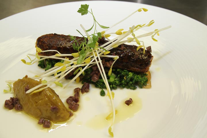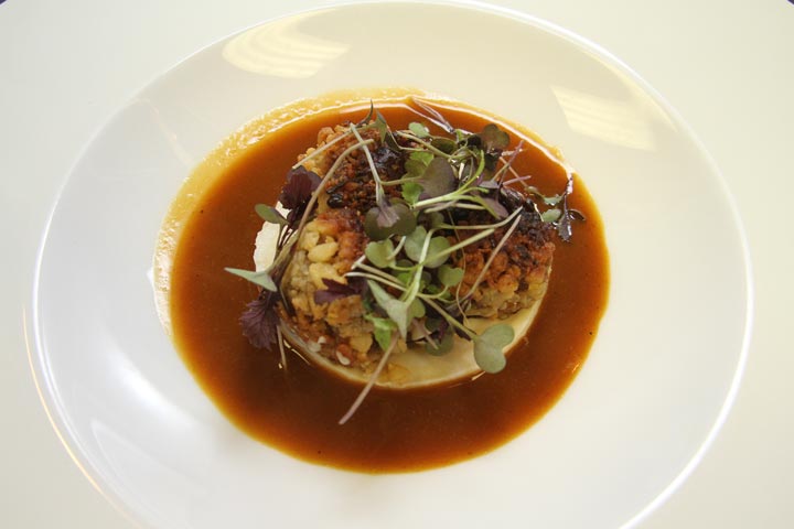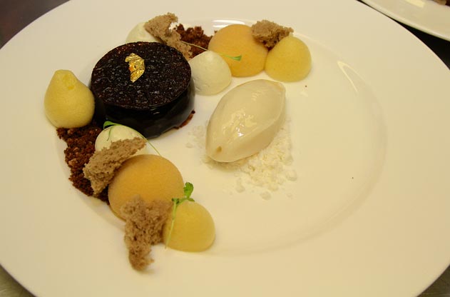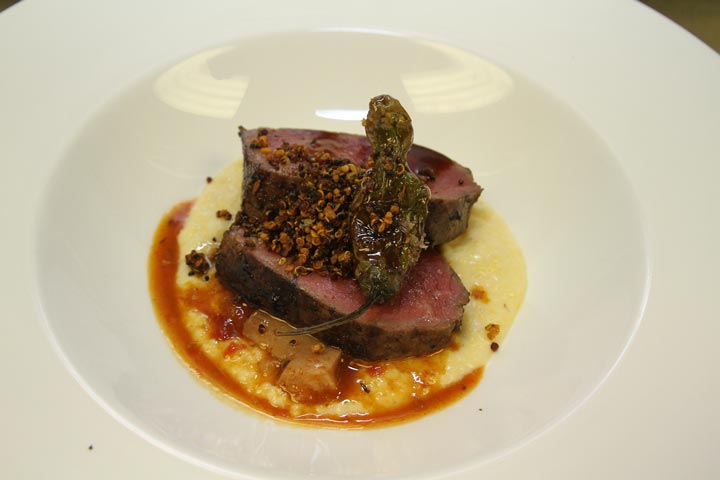El próximo plato fue unas albóndigas de cabrito en curry con un puré de coliflor y mostaza verde crujiente junto a Delas Domaine Des Genets Vacqueyras Rhône 2014. El siguiente plato fue una carne añejada seca por 50 días con polenta de maíz orgánico, mascarpone, cabeza de cerdo, pimiento shisito y quínoa maridado con Chateau Tour Seran Medoc Bourdeaux 2009.