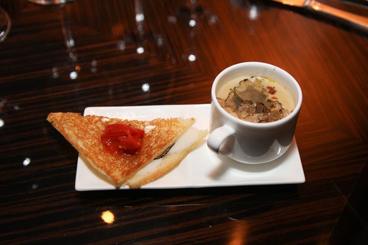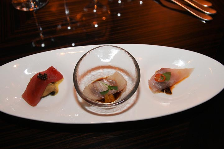 El primer curso por el Chef Cuevas consistió de un Trio de crudos con atún, hiramasa y cartucho del país, acompañado por el Besserat de Bellefon Cuvee des Moines Blanc de Blanc.