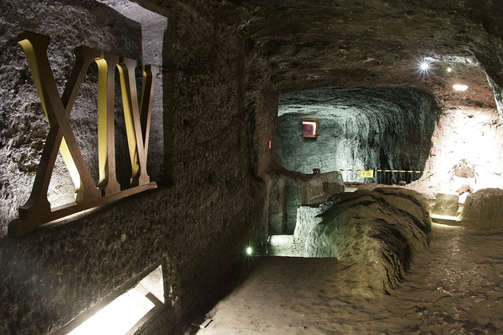 Las Rutas del minero o recorridos guiados, hacen que el turista recorra esta grandeza que se divide en tres tramos básicos: el primero lo constituye el vía crucis, con escenas bíblicas por medio de la Cruz, el segundo conformado por la cúpula desde donde se puede observar a 145 metros de distancia la cruz mayor de 16 metros de altura, ubicada en la nave central, de igual manera conforman el tramo intermedio la rampa de descenso a las cámaras, los balcones superiores y el atrio. Y en el tercer tramo se encuentra La Creación, hecha en alto relieve en mármol, y el pesebre.