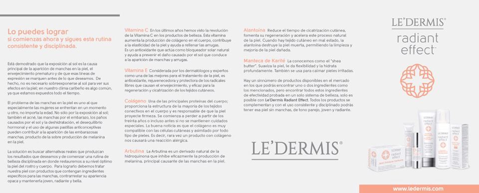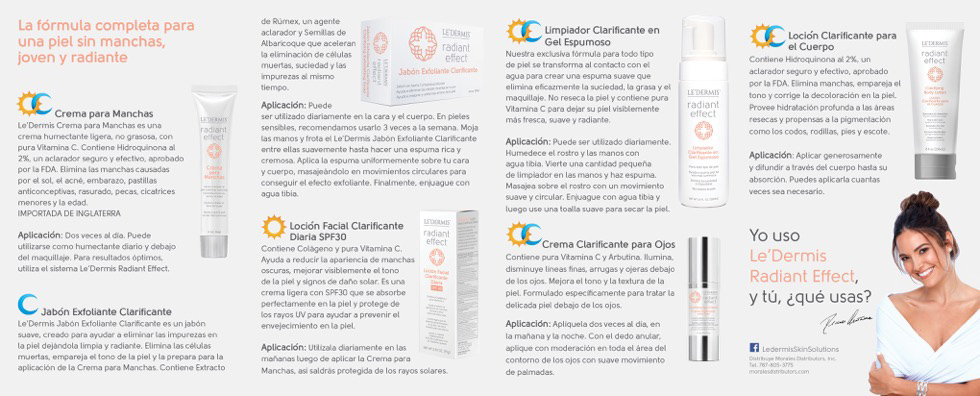 “La línea Le’Dermis Radiant Effect es única en el mercado porque combina seis ingredientes de efectividad comprobada en un solo sistema de belleza. Todos los productos de la línea se complementan y al usarlo de forma consistente y disciplinada toda mujer podrá tener una piel sin manchas, de tono parejo, joven y radiante”, dijo Morales.