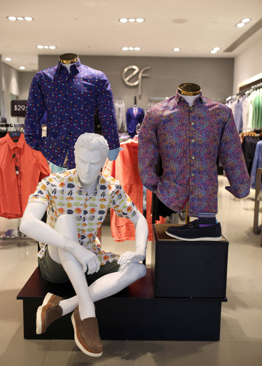 En un enmarcado contemporáneo y masculino que combina los colores gris, rojo y negro con acentos en madera oscura y metal, La Esquina Famosa ofrece en este centro comercial al igual que en el resto de sus tiendas, una variedad de mercancía que incluye etiquetas, trajes, guayaberas de hilo, camisas tipo resort, polos, accesorios, mahones, diversidad de pantalones en un surtido de colores y las camisas fashion que los distingue a precios muy razonables. “La idea es garantizar algo para cada tipo de cliente: desde el más conservador hasta el moderno”, afirmó.