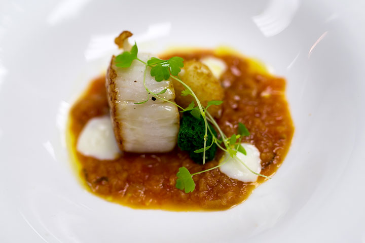 Como preámbulo de la cena de cinco cursos, se sirve un surtido de canapés acompañado de Cuvée Aurora, de los viñedos de Alta Langa, en Piemonte. El primer curso presenta un tartar de res con helado de queso parmesano y hojuelas de foie gras, acompañado del vino Principessa Gavia, también de Piemonte. El segundo plato está compuesto de la tradicional sopa toscana pappa al pomodoro con vieiras y mozzarella crujiente, pareada con el Fontanelle Chardonnay, de la región de Montalcino en la Toscana.