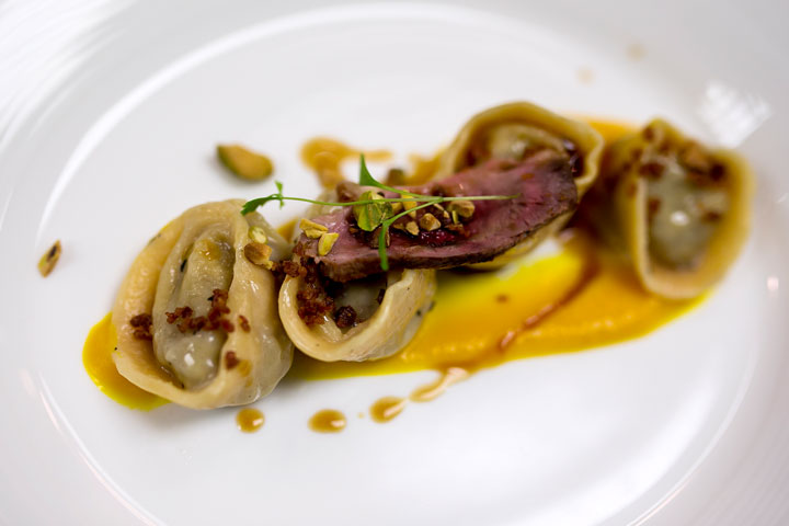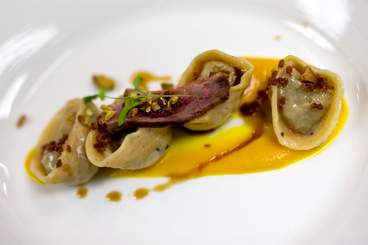 ravioli de pato con crema de calabaza y prosciutto.